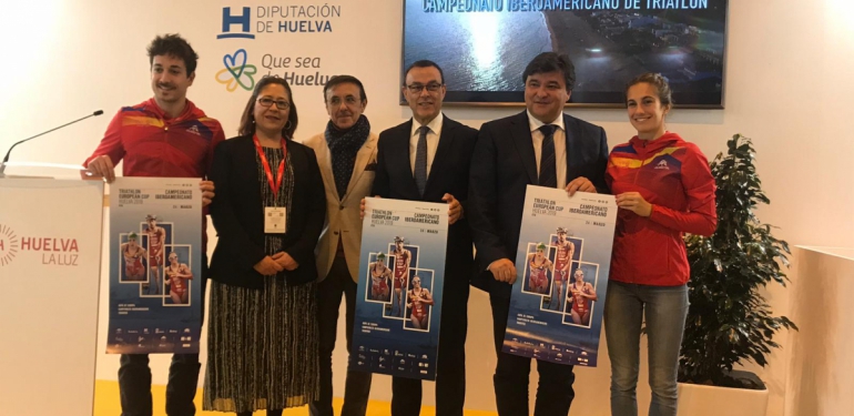 El alcalde de Huelva, Gabriel Cruz; el presidente de la Diputación, Ignacio Caraballo; la alcaldesa de Punta Umbría, Aurora Águedo; y el presidente de la Federación Española de Triatlón (Fetri), José Hidalgo, han presentado esta mañana en la Feria Internacional del Turismo (FITUR) el Campeonato Iberoamericano de Triatlón y la primera prueba de la Copa de Europa, que se celebrarán el 24 de marzo en Huelva y Punta Umbría. Un acto que ha estado arropado por los triatletas Cecilia Santamaria y Uxio Abuin, que participaron en la Copa del Mundo del Triatlon ITU Huelva 2017, donde participaron triatletas de 34 nacionalidades de 5 continentes.