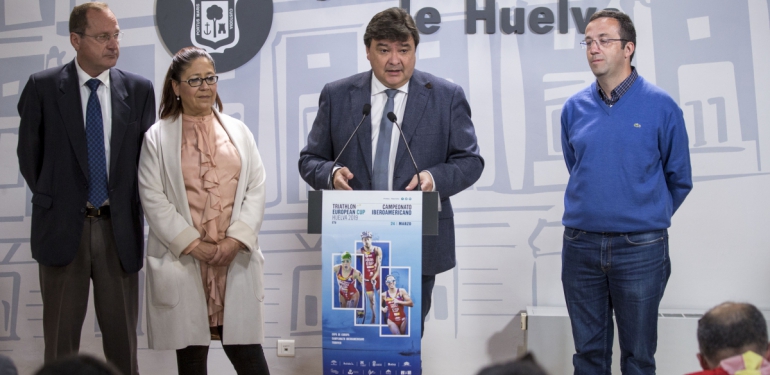 El alcalde Huelva, Gabriel Cruz; el diputado de Hacienda y Deportes, Francisco Javier Martínez Ayllón; la alcaldesa de Punta Umbría, Aurora Águedo; y el representante de la Federación Española de Triatlón, Jorge García, han presentado esta mañana en rueda de prensa el programa de actividades que se van a llevar a cabo a lo largo de esta semana, vinculadas a la Copa de Europa de Triatlón y el Campeonato Iberoamericano, que se celebrará el próximo domingo, con salida desde Punta Umbría y llegada a Huelva.