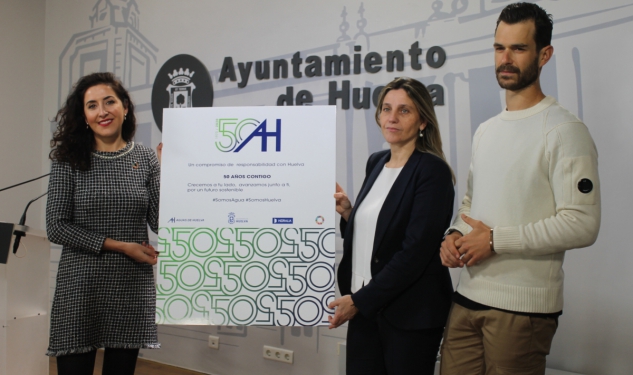 La primera teniente de alcalde de Economía, Presidencia y Relaciones Institucionales del Ayuntamiento y presidenta de Aguas de Huelva, María Villadeamigo, acompañada de Isabel Butrón, directora gerente de la empresa, han presentado el logotipo y esbozado el programa de actos organizado para celebrar el 50 aniversario de Aguas de Huelva, animando a los onubenses “a participar e involucrarse en la celebración de estas bodas de oro, porque los onubenses son el alma y la razón de ser de esta señera empresa”.