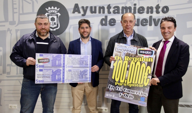 El concejal de Empleo, Desarrollo Económico y Proyectos, Jesús Manuel Bueno, junto al presidente de Calles del Centro, Carlos Moral y el director de Aqualón, Alejandro Cintado han presentado esta mañana en rueda de prensa una nueva campaña enmarcada en el Plan de Dinamización Comercial que “el Ayuntamiento de Huelva y los representantes del sector venimos implementando desde el año 2015 con una programación de eventos e iniciativas destinadas a incorporar atractivos, ambiente y vida a las principales zonas comerciales de la ciudad”. En esta ocasión, como ha señalado Bueno “damos la bienvenida y apoyamos una iniciativa que llega de la mano de Calles del Centro y Aqualón, presentando un plan de acción común para generar sinergias positivas al ofertar comercio y ocio”.