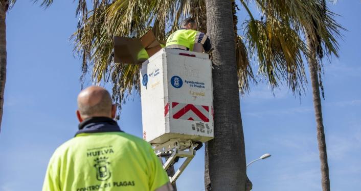 El Ayuntamiento de Huelva está desarrollando una campaña preventiva anti-roedores consistente en la instalación de barreras físicas sobre las palmeras de la ciudad. En este sentido, se ha procedido ya a la instalación de 75 collares sobre los troncos o estípites de las palmeras, de modo que se evite el acceso de los roedores a este tipo de arbolado, en el que sus frutos, los dátiles, suponen una fuente de alimentación.