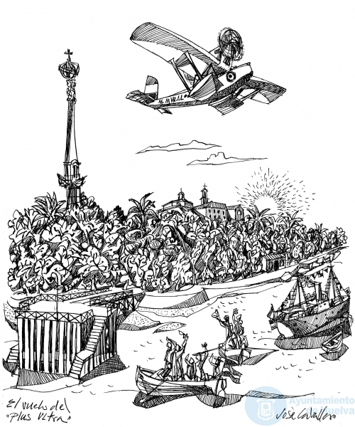 Dibujo de José Caballero que representa el vuelo del Plus Ultra sobrevolando el entorno de La Rábida. Archivo Municipal de Huelva. Cuadernos de Huelva de José Caballero