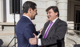 El alcalde de Huelva, Gabriel Cruz, acompañado de la corporación municipal, ha recibido esta tarde en el Ayuntamiento de Huelva al presidente de la Junta de Andalucía, Juan Manuel Moreno Bonilla, e