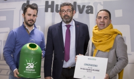 El alcalde de Huelva, Gabriel Cruz, y Gonzalo Rodríguez San Juan, director de Administraciones Locales de Ferrovial Servicios en España, acompañados de Vicente Ponce, p