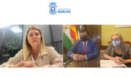El alcalde de Huelva, Gabriel Cruz; acompañado de la concejala de Comercio y Mercados, Tania González; ha mantenido hoy una videoconferencia con la directora de Área Inmobiliaria y Expansión de Ind