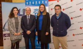 La concejala de Políticas Sociales e Igualdad del Ayuntamiento de Huelva, María José Pulido, acompañada de la directora gerente de Aguas de Huelva, Isabel Butrón, el presidente de Cruz Roja Huelva